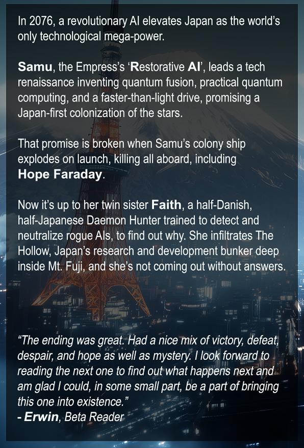 Now it’s up to her twin sister Faith, a half-Danish, half-Japanese Daemon Hunter trained to detect and neutralize rogue AIs, to find out why. She infiltrates The Hollow, Japan’s research and development bunker deep inside Mt. Fuji, and she’s not coming out without answers.